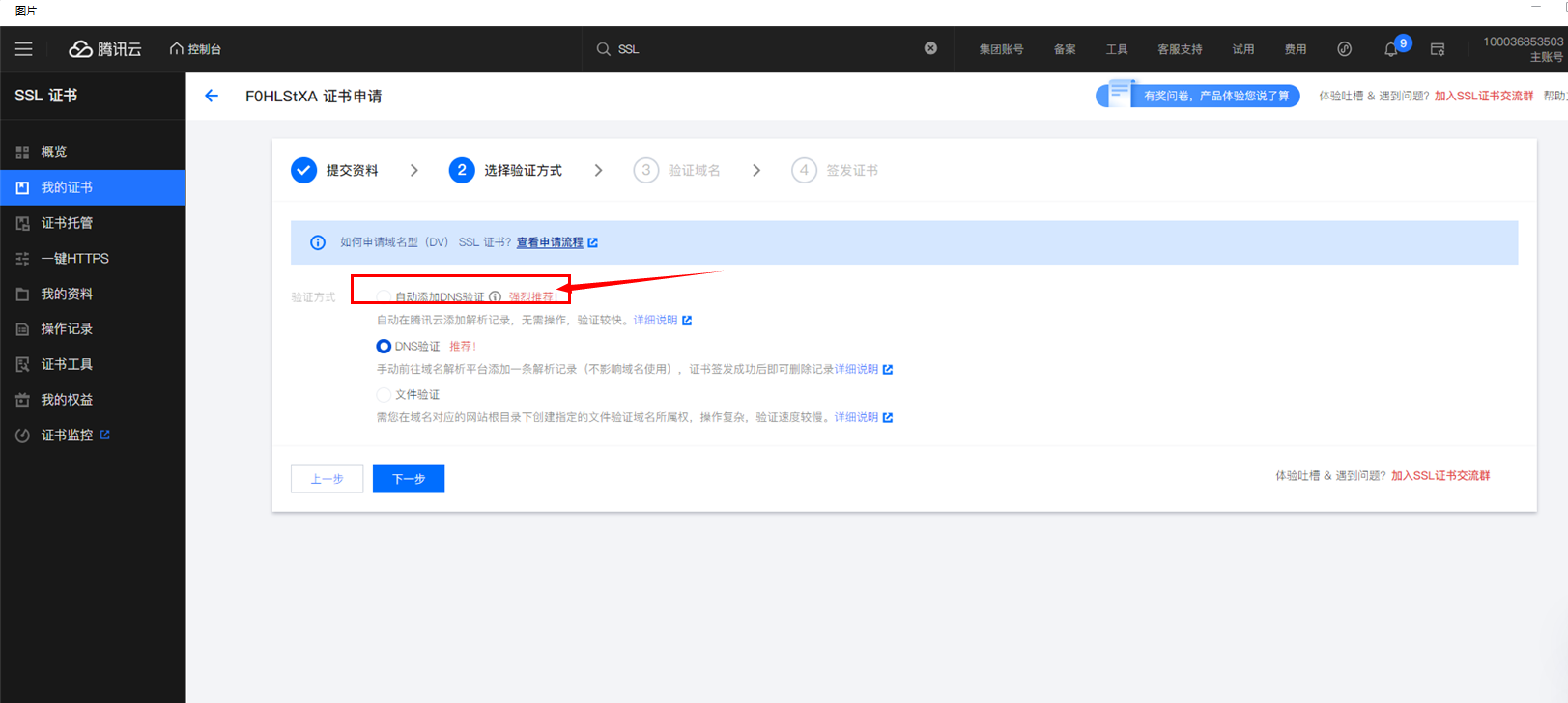 提交资料后,选择:自动添加DNS验证
